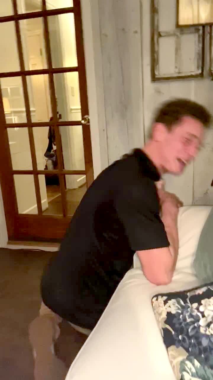 A young girl blows her trumpet at her dad as he enters the house. The man grips his heart and yells "Jesus Christ."