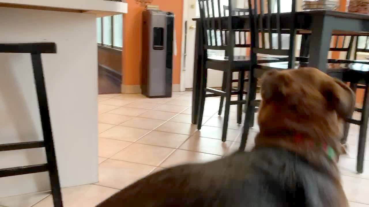 A dog sits in a living room and appears to play a banjo. Dogs with Human Hands.