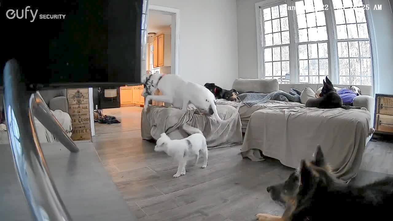 "Dog Den Doodie" A small dog on a leash walks around a new house with the camera woman. She excitedly talks about what she will do with all of the rooms of the new house. Then the dog poops on the floor. She screams and picks the dog up.