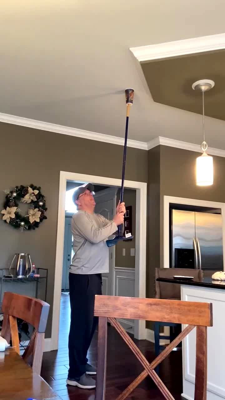 A bulldog dog accidentally pulls a man's shorts down in the kitchen while she scratches his leg as she tries to get the cordless vacuum cleaner he holds above his head.
