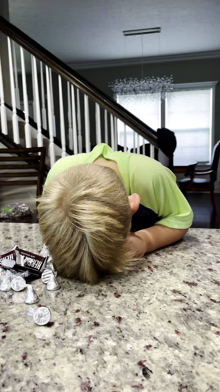 Two boxer dogs in a kitchen lick their lips every time they hear a dog toy squeak.