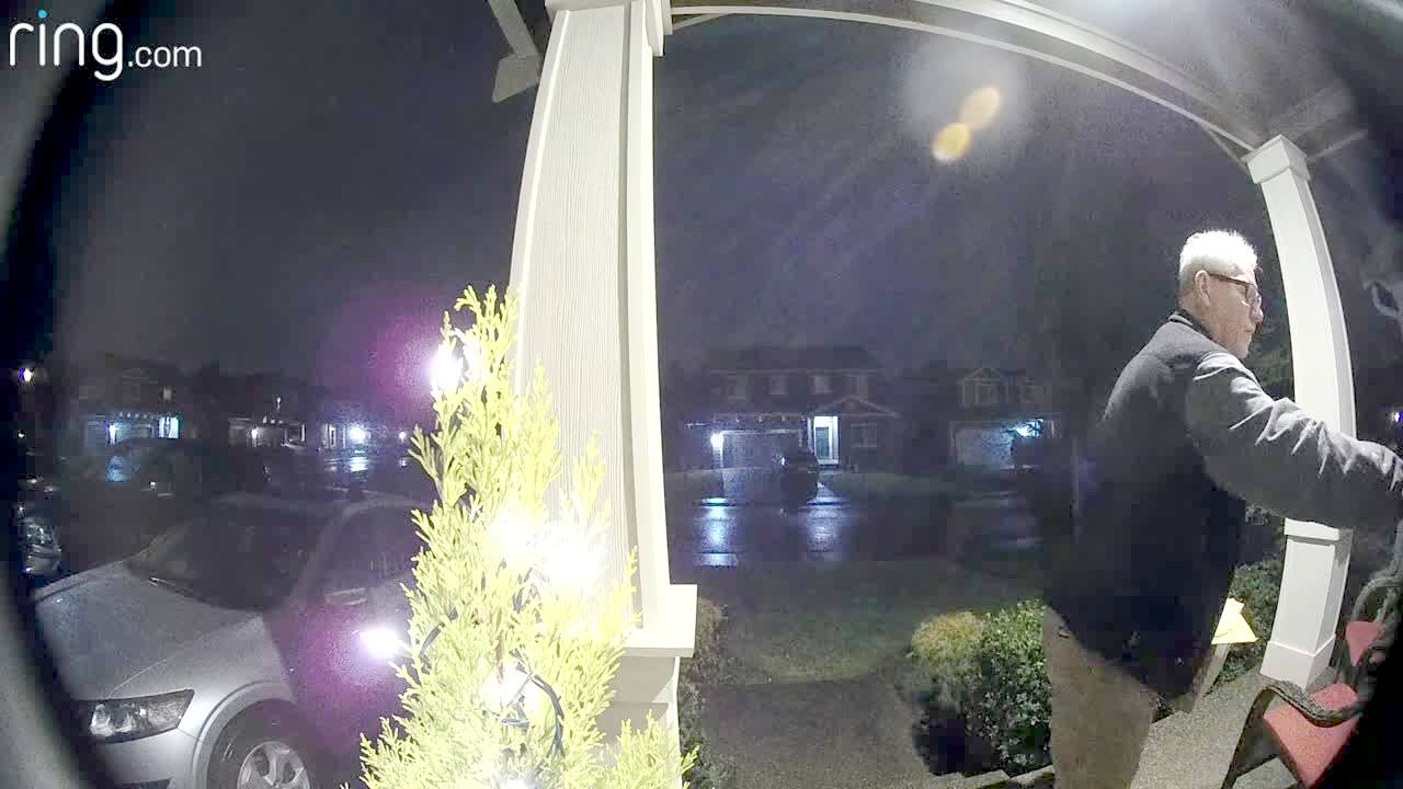 A man slips and falls down his front steps. Doorbell security footage.