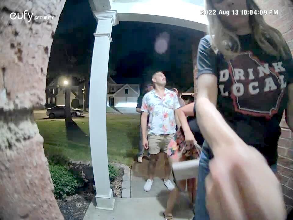 A group of people approach a front door at night. A man points out a large bug on the wall. The insect moves and flies around, and then a woman screams. She jumps back and when she turns around, she hits her forehead on the porch pillar. Security footage.