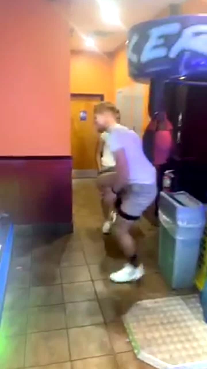 A young man tries to kick a punching bag at an arcade, but he misses and kicks a game machine.