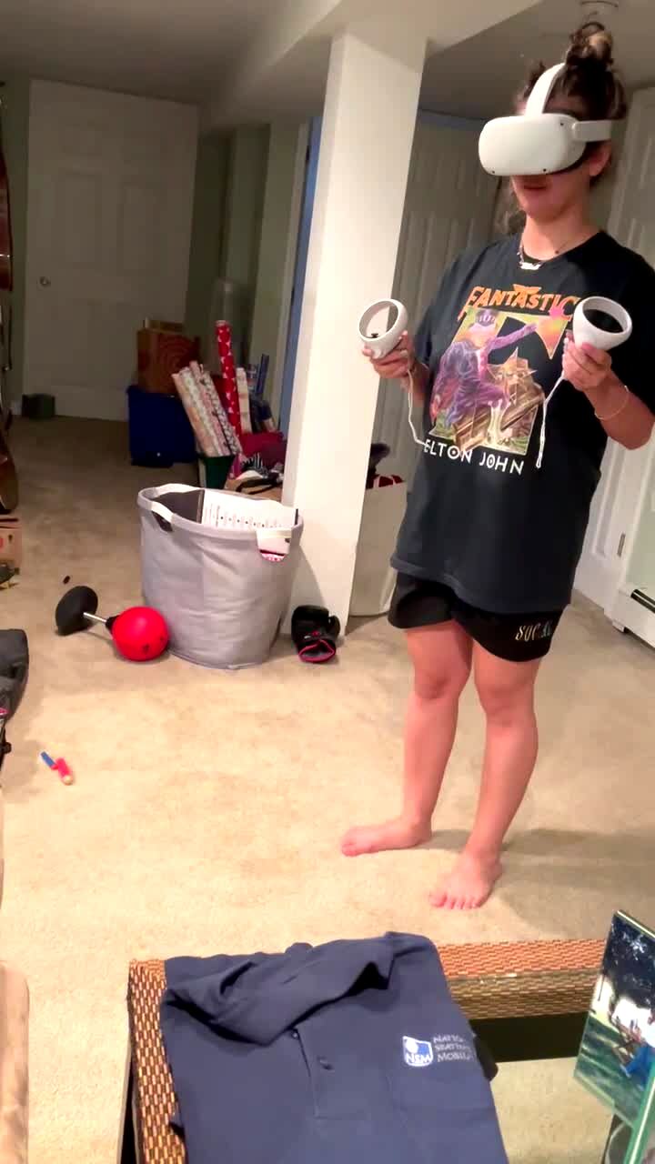 A young woman uses a virtual reality headset in a living room, then a Chihuahua dog touches her leg and she yells.