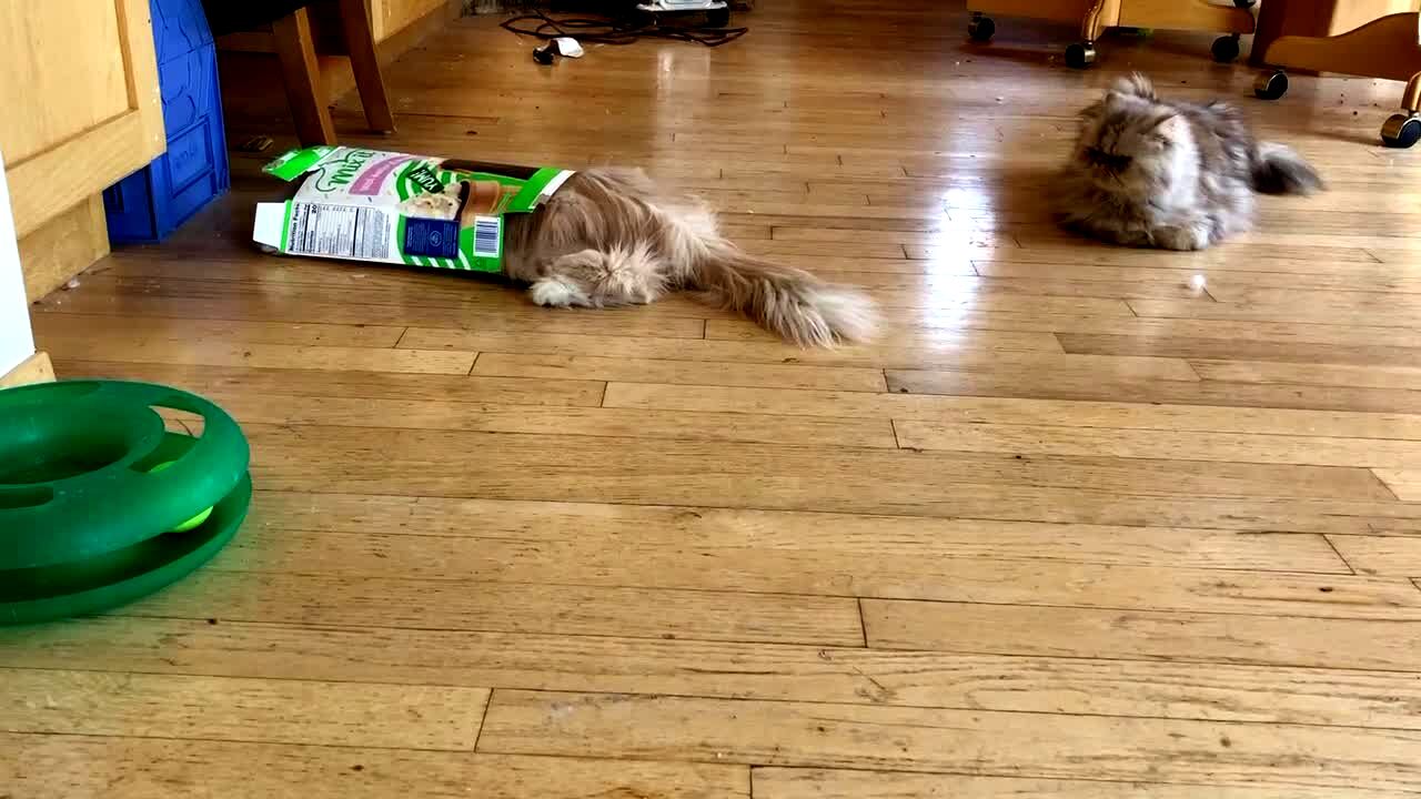 An empty cereal box lies open on the floor and a cat runs and slides into and glides across the kitchen floor.