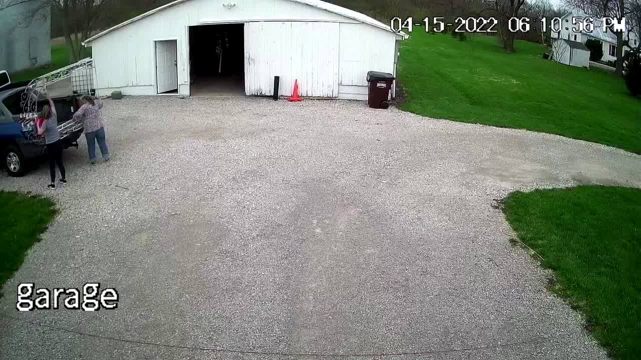 Two women take a trellis out of a truck bed at a farm. The weight of it pulls them down and they trip and fall over it in a driveway. Security footage. No audio.