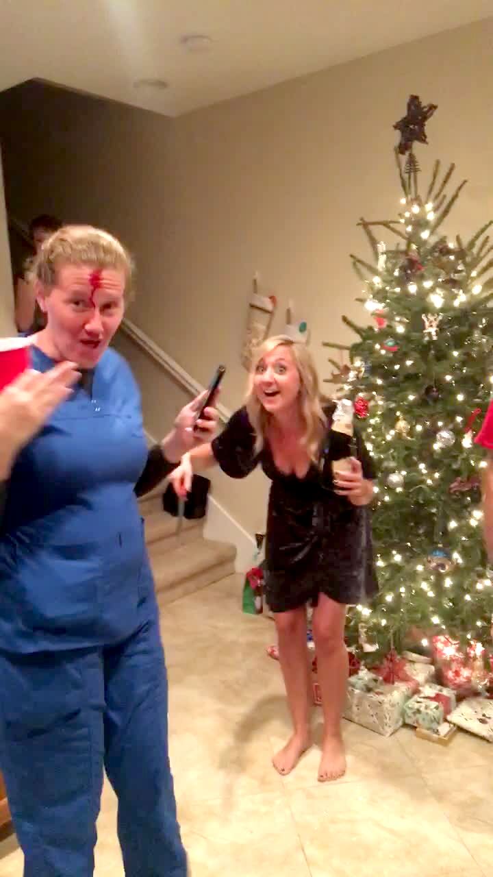 Four young women sit on the back of a couch at a Christmas party when the couch tips over and they all fall on the floor indoors.