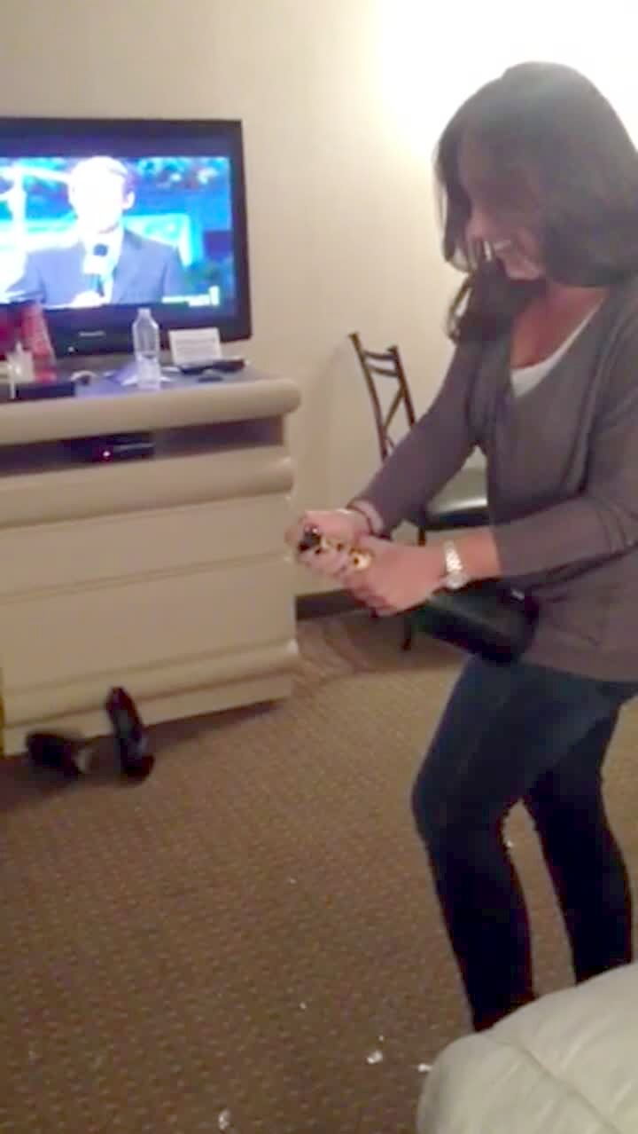 Woman opens champagne bottle, cork bounces off wall and hits woman in head.