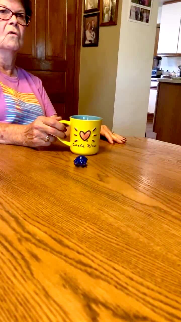 A young boy's toy spider jumps into a senior woman's coffee cup in a dining room, and she screams while the young boy yells "no."