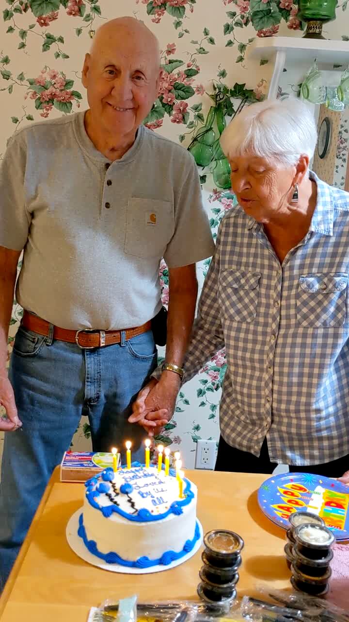 A family sings Happy Birthday to a senior man and woman in front of a birthday cake in a home. A woman tells the senior man to make a wish and the senior woman says "Oh no, not again tonight" and their family laughs.