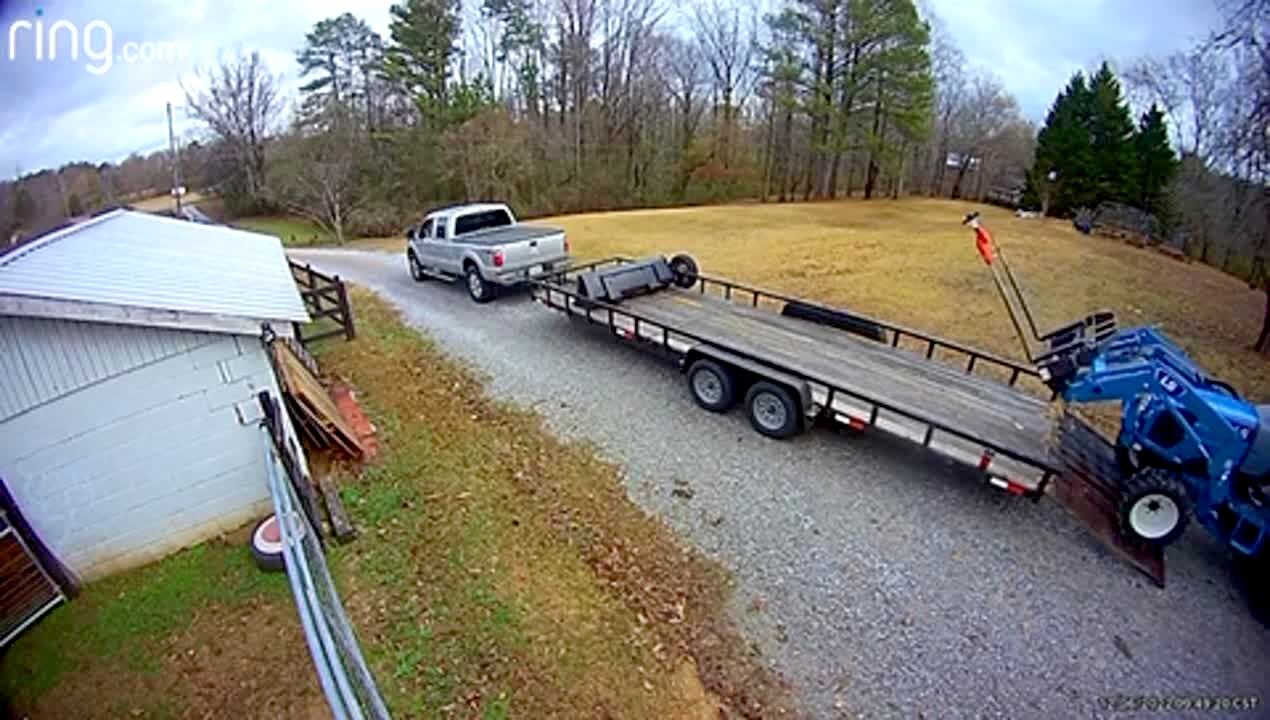 A man on a farm tries to load a tractor onto a trailer, but the brakes let loose and the truck and trailer roll down a hill into some trees. The man jumps off and tries to catch up to the truck but falls.