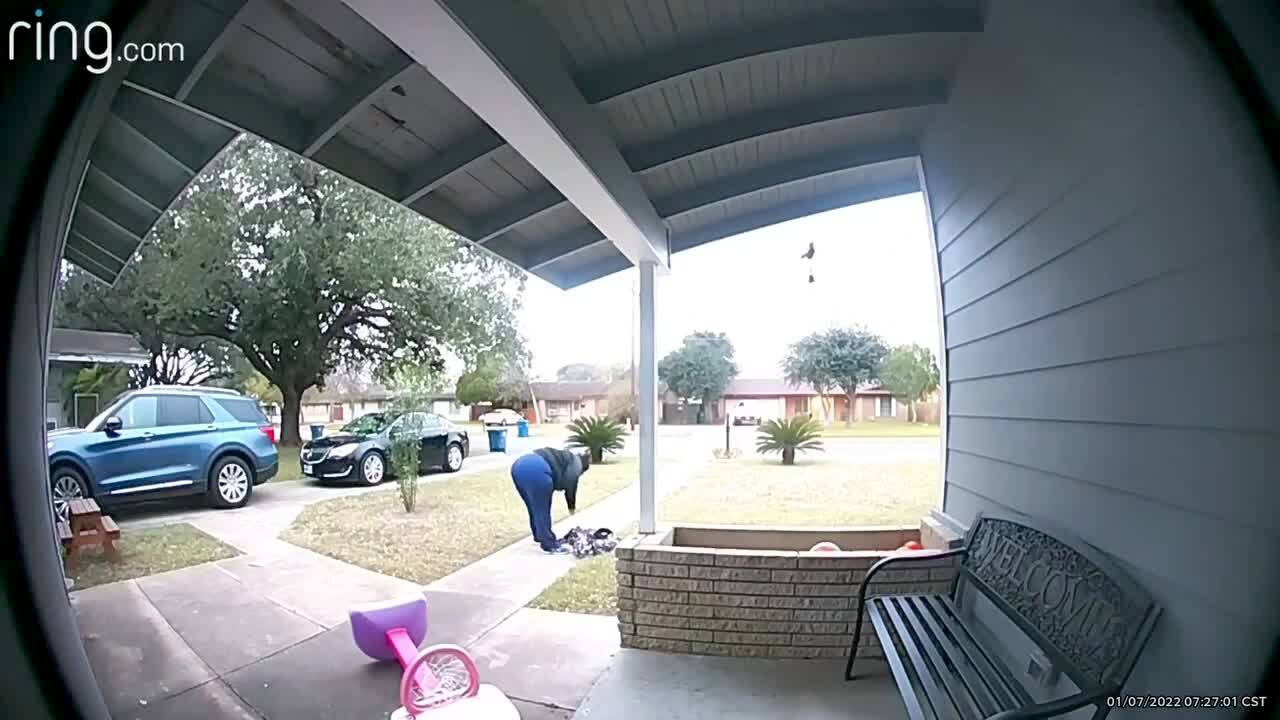 Security footage of a young girl who tries to get someone's attention in the house. She first throws a football to the camera and misses. Then she throws a Slinky spring and it lands perfectly on the camera. Loud noise