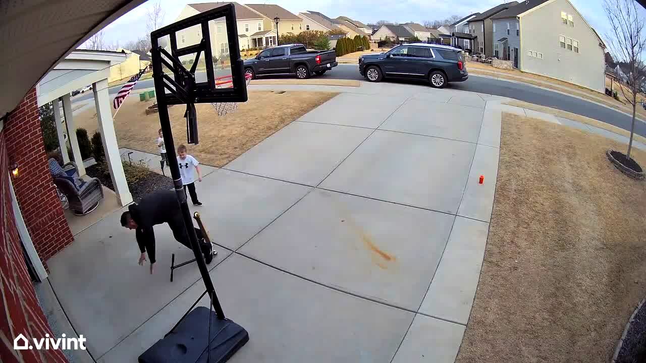 A man and a young boy play basketball on a driveway. The man leans against the hood of a car and throws the basketball at a full-sized hoop, but the ball bounces off that hoop and instead goes into the basket in a small child-size basketball hoop. They cheer. Security footage. Winning
