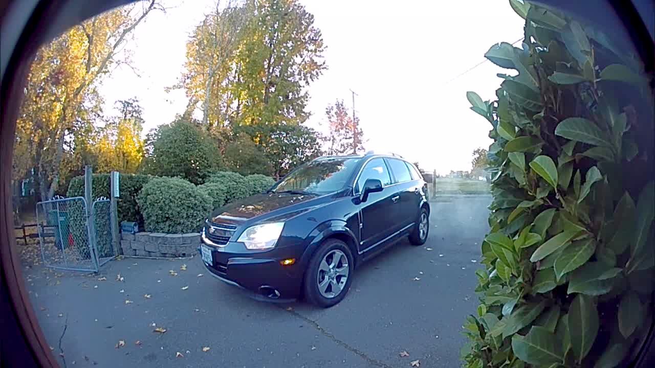 A woman hops out of her vehicle to put her dog back after he runs out of his gate. The car starts to roll backwards as chaos ensues and the car crashes into the house offscreen. Security footage.