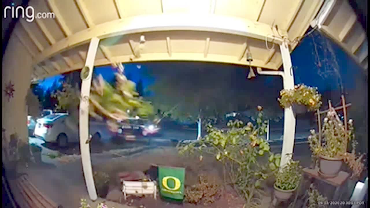 Two young girls fall on a walkway in a front yard. Security Footage Night