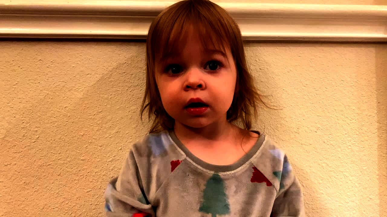 A man films a closeup of a tot girl in the hallway and asks her if she had used any of his hair products. The tot girl responds and the man pulls the camera back to reveal that the tot girl has a long strand of hair that sticks straight up in the center of her head.