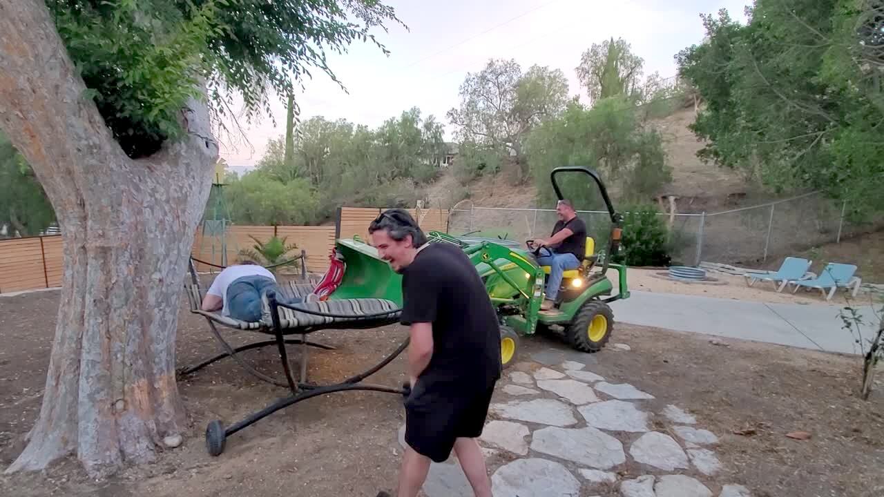 A man drives a tractor forward with another man laying in the bucket. He gently lowers the friend onto a hammock while another friend looks on and laughs.