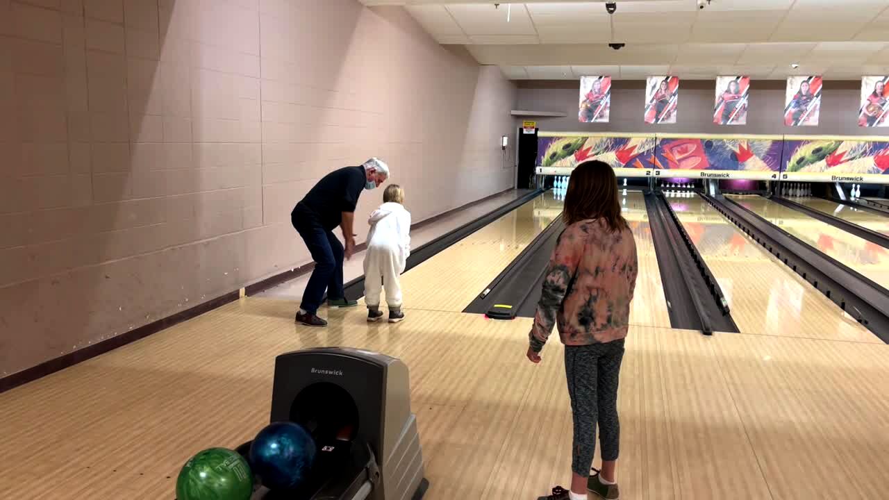 A senior man attempts to help a young girl bowl when he slips in the bowling lane and falls.