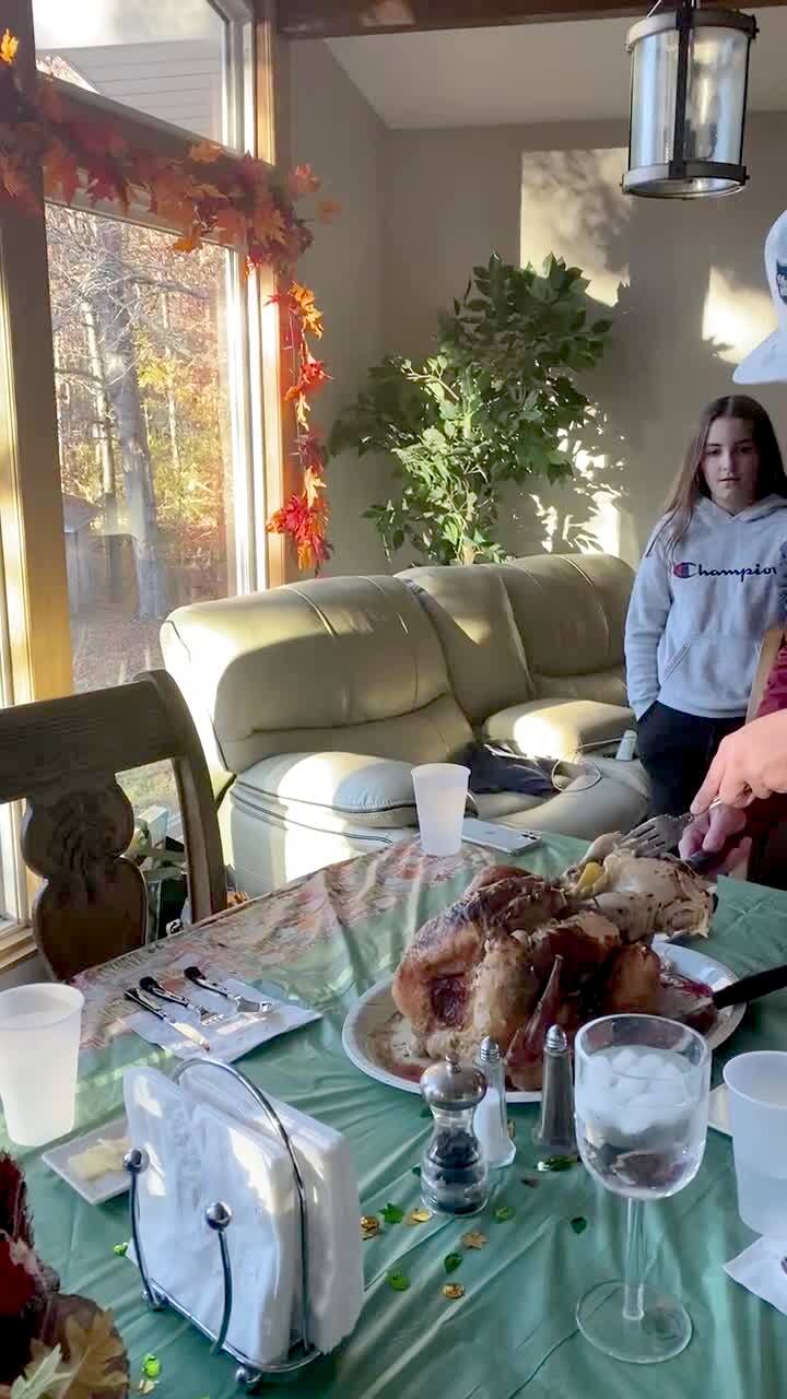 A man carves turkey for Thanksgiving dinner in a dining room, then he pretends to find a baby turkey inside of it, but it is a chicken. Ayoung woman believes it until a woman says that turkeys lay eggs.