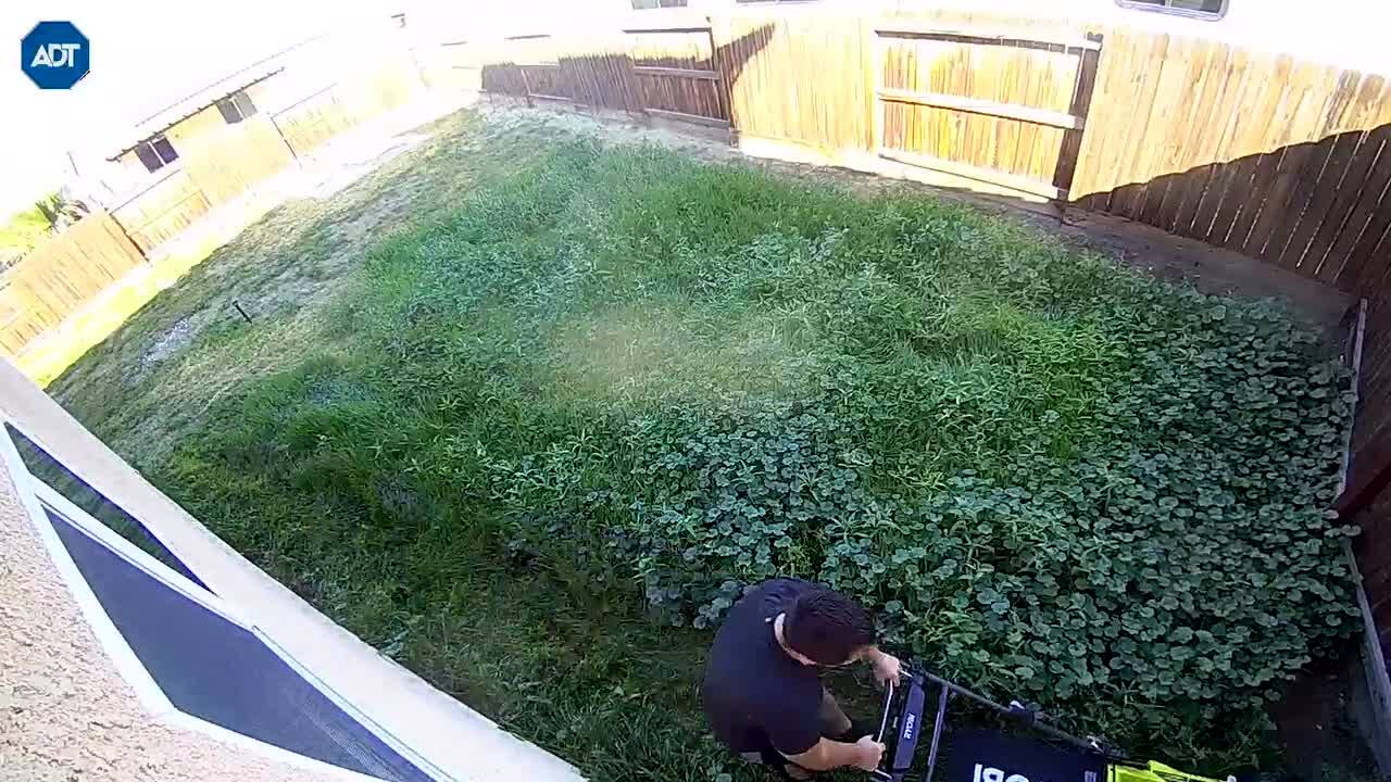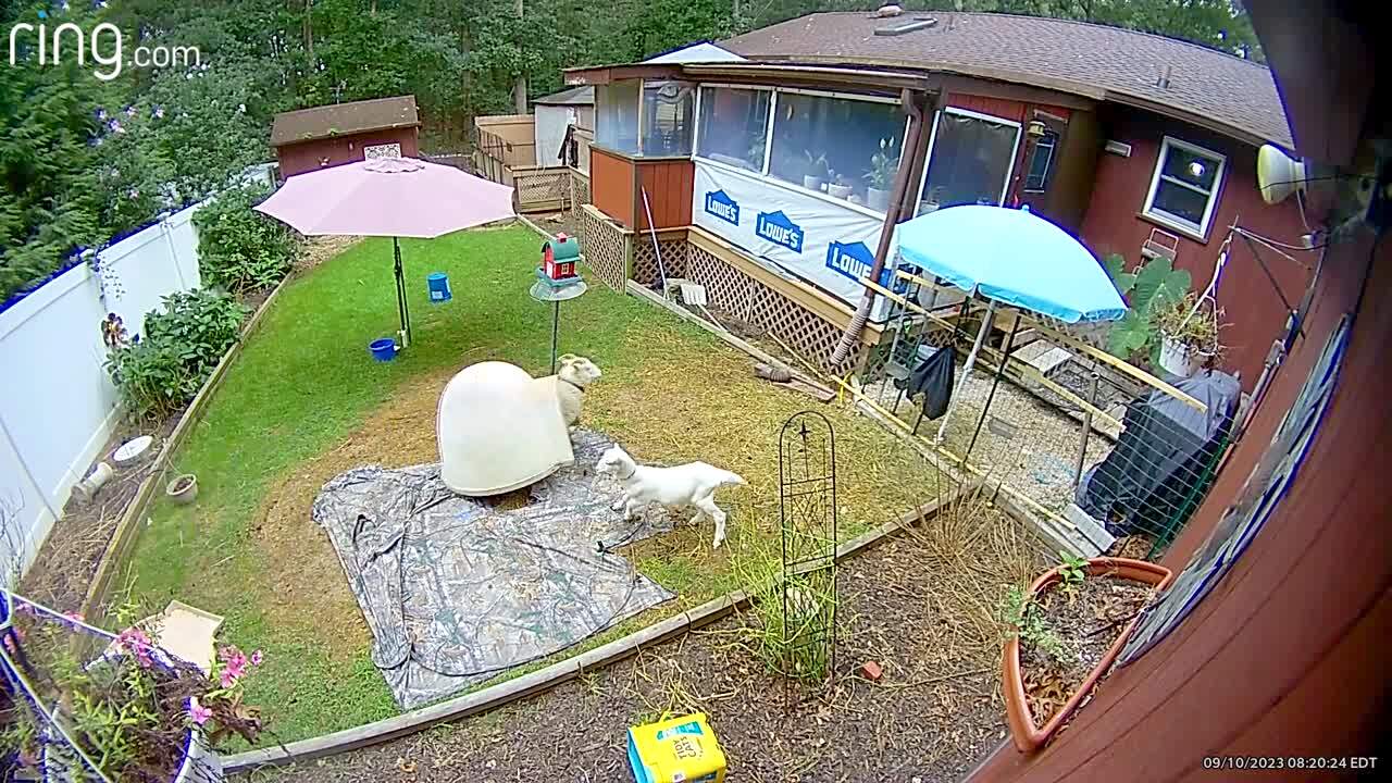 A dog walks into a pond in the backyard. A woman tries to pull her out but falls into the water instead. She steps out and the dog comes out by herself. Security Footage.
