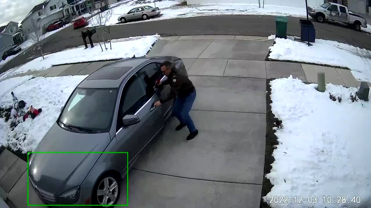A Border Collie puppy runs into a backyard and slips and slides down a snowy hillside.