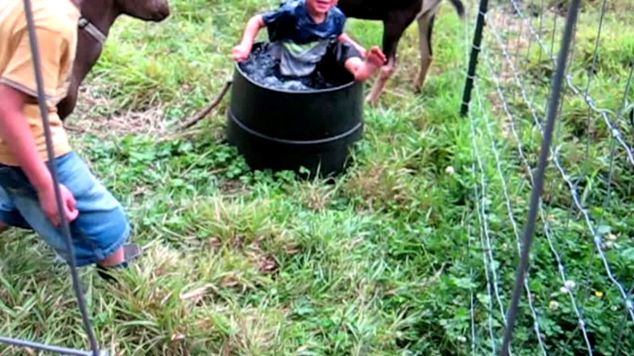 Little boy tries to ride a goat inside a pen, he falls off when the goat throws him into a tub of water. Petting zoo, farm.