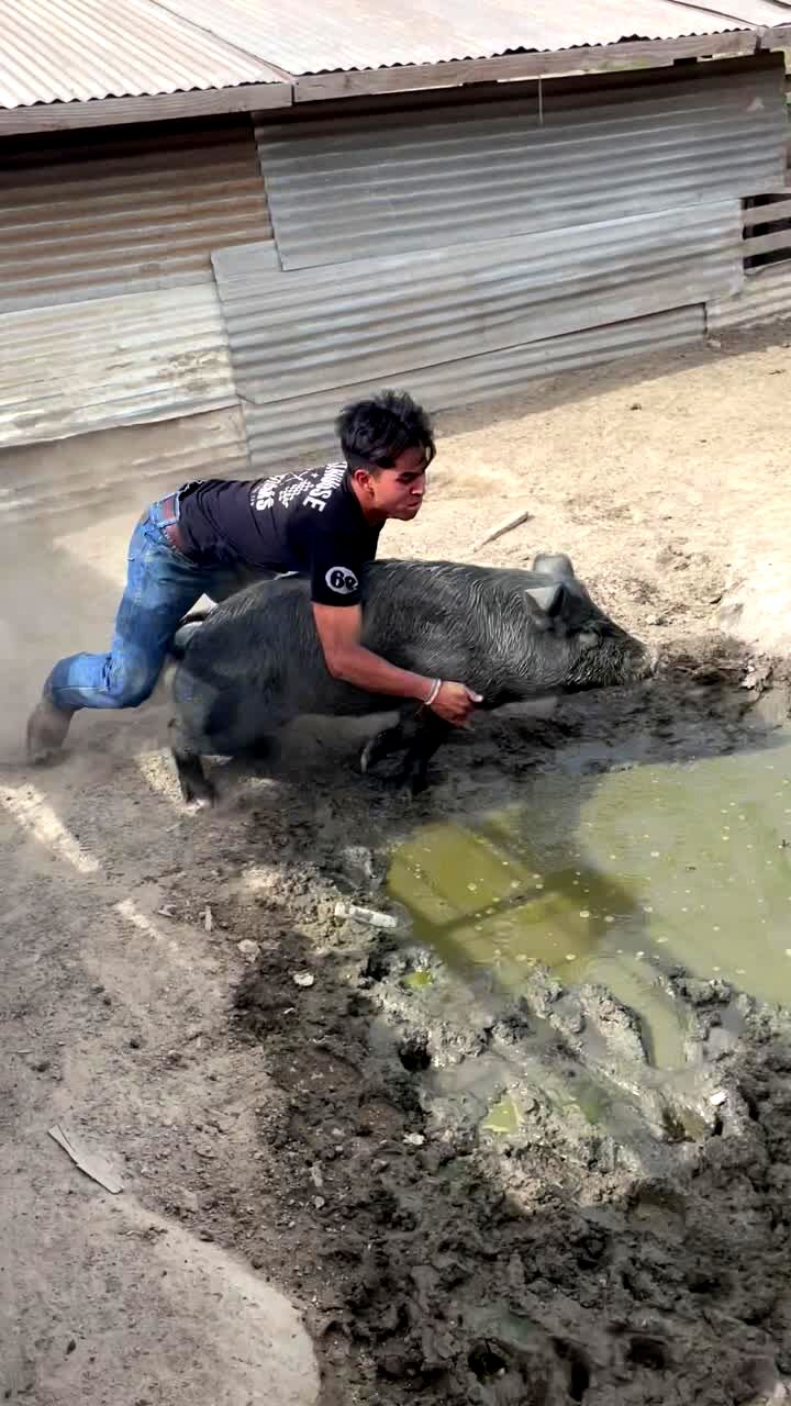A teen boy outside tries to catch a pig but as he holds onto it, it drags him through mud. Featured talent cleared (the boy who tries to catch the pig).