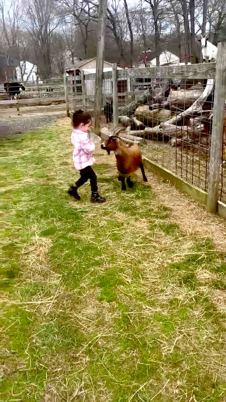 A young girl at a farm laughs and teases some goats on the other side of a fence with some food. One goat jumps though the fence. The girl has a late reaction but screams.