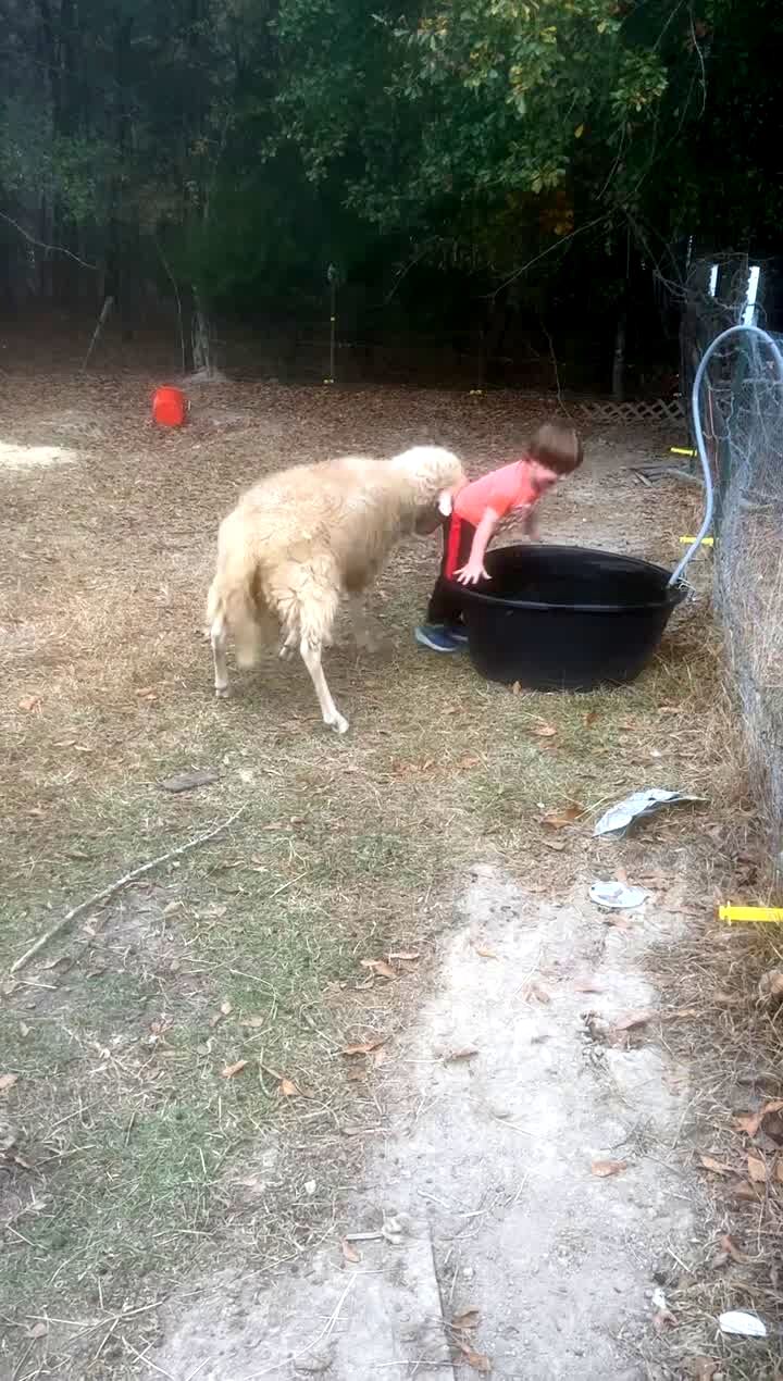 A young boy plays near a tub of water outside when a sheep comes up behind him and knocks him into the water.