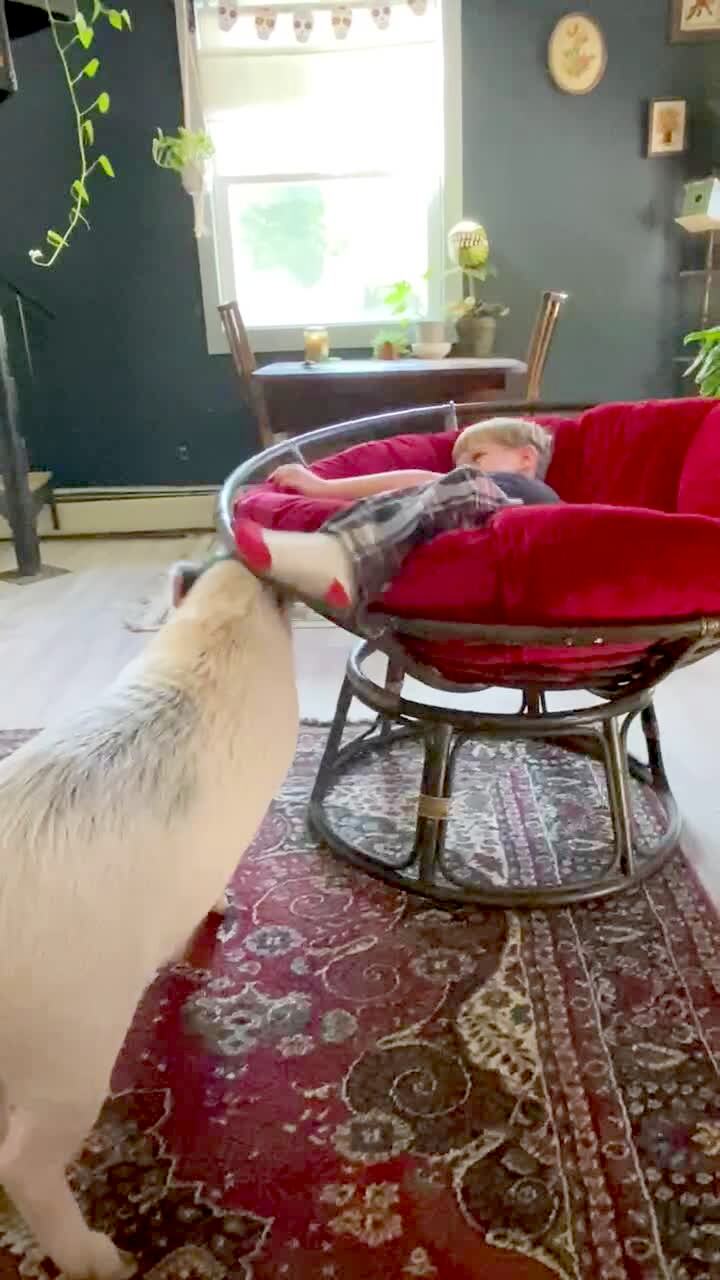 A young boy cackles and wobbles on a chair when a pig nudges at it in a living room.