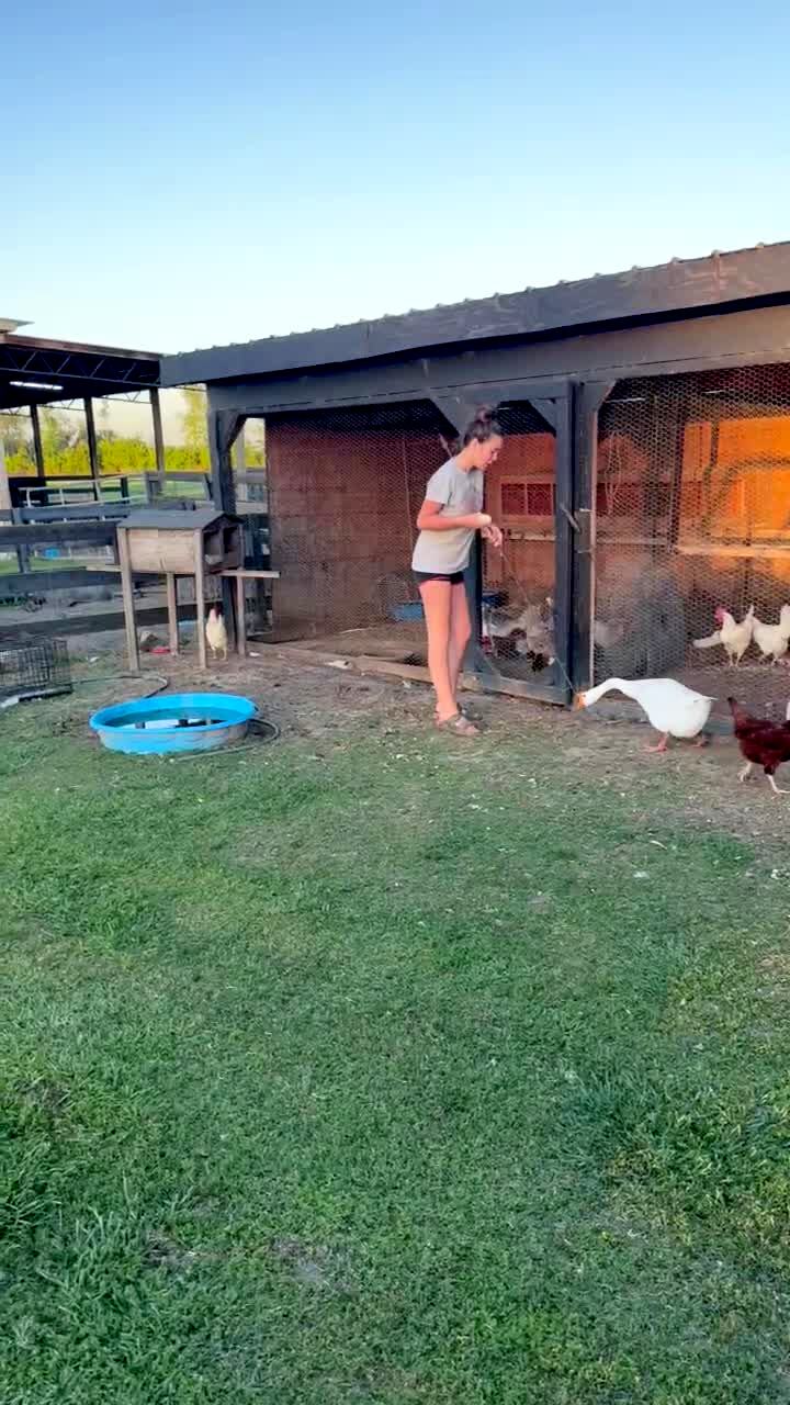 After a teen girl puts a baby chicken back into its cage on a farm, a duck comes after her. She shrieks then trips over a dirty kiddie pool, falls on her back and loses her shoe in the process.