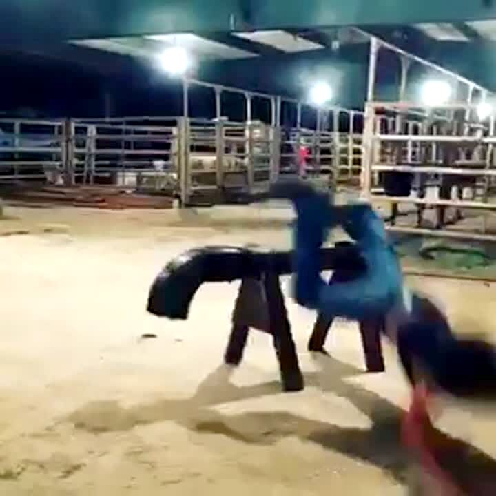 A woman walks on the treadmill and a man tries to scare her and jumps on it and wears a chicken mask but he falls and she laughs at him.