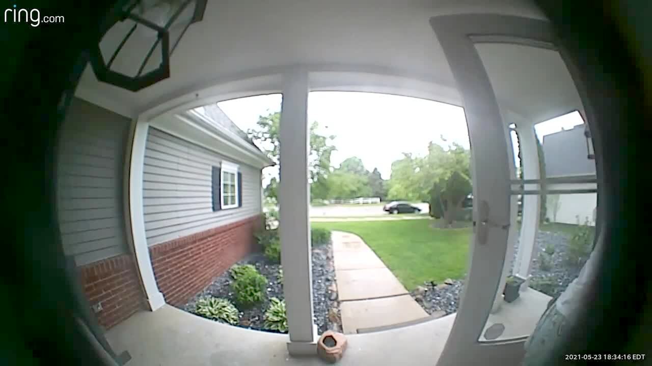 A man walks out of the front door to his house and is frightened by a snake that is right outside his door. Security Footage