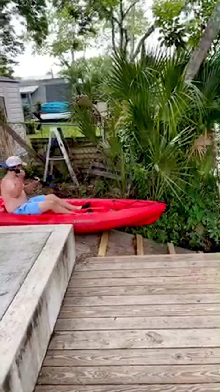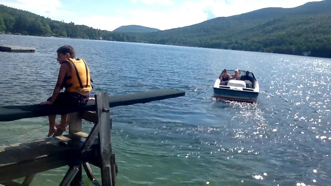 Man falls off a row boat while reaching for a volley ball for a group of kids