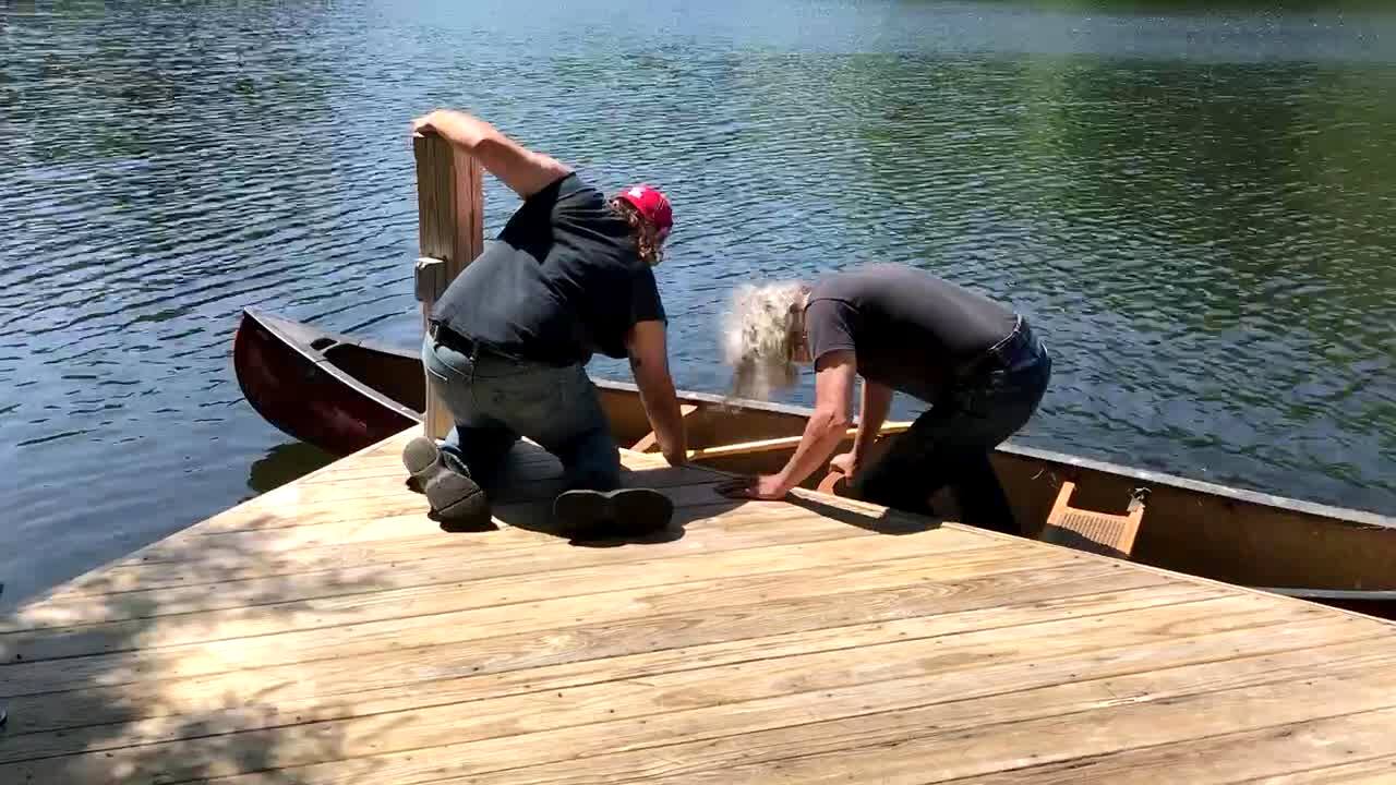 A man and a senior man climb into a canoe on a lake, then it flips over and dumps them into the water.