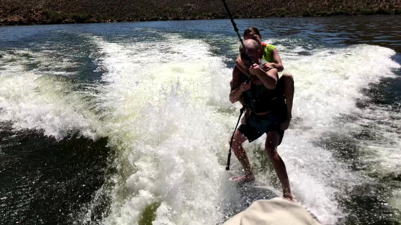 A woman rides on a man's back as he wake-surfs and she falls over.