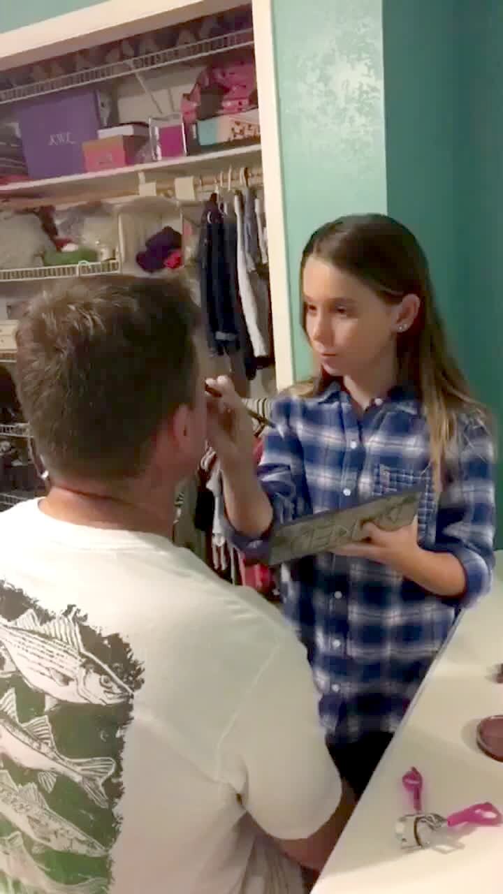 Teen girl puts makeup on her dad who sits in a chair. Wig and bow reveal. #AFVDad musical.ly AA