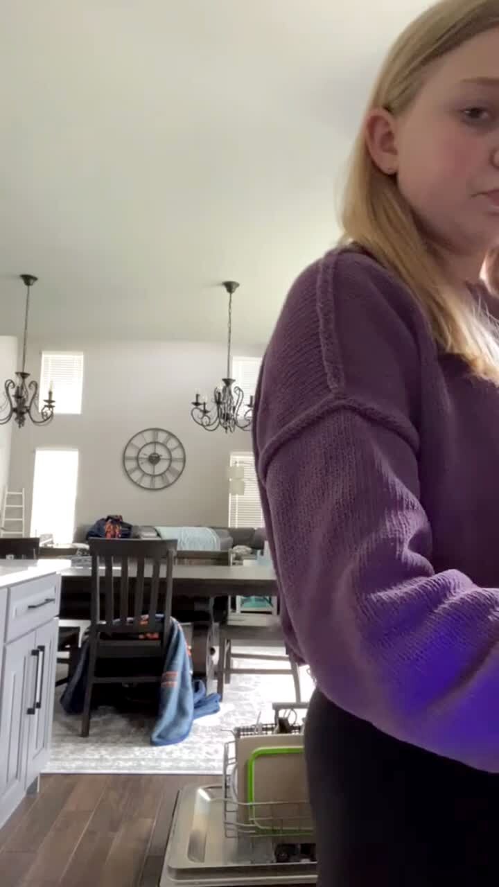 A young girl walks backwards and falls over an open dishwasher in the kitchen.