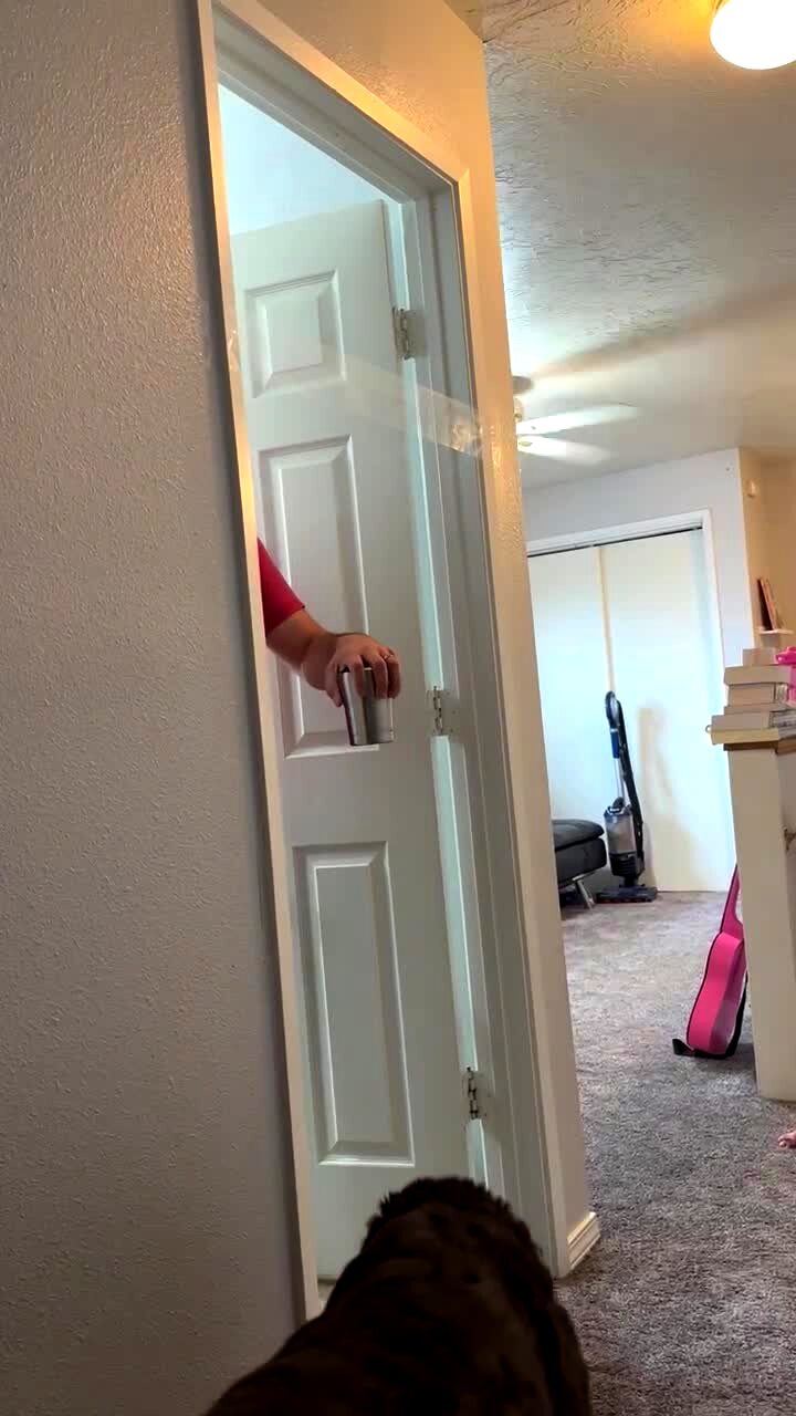 "Canine Camera Caper" A doodle dog jumps over a baby gate at home, then he uses his paws to turn a security camera around. TikTok video. Security footage.