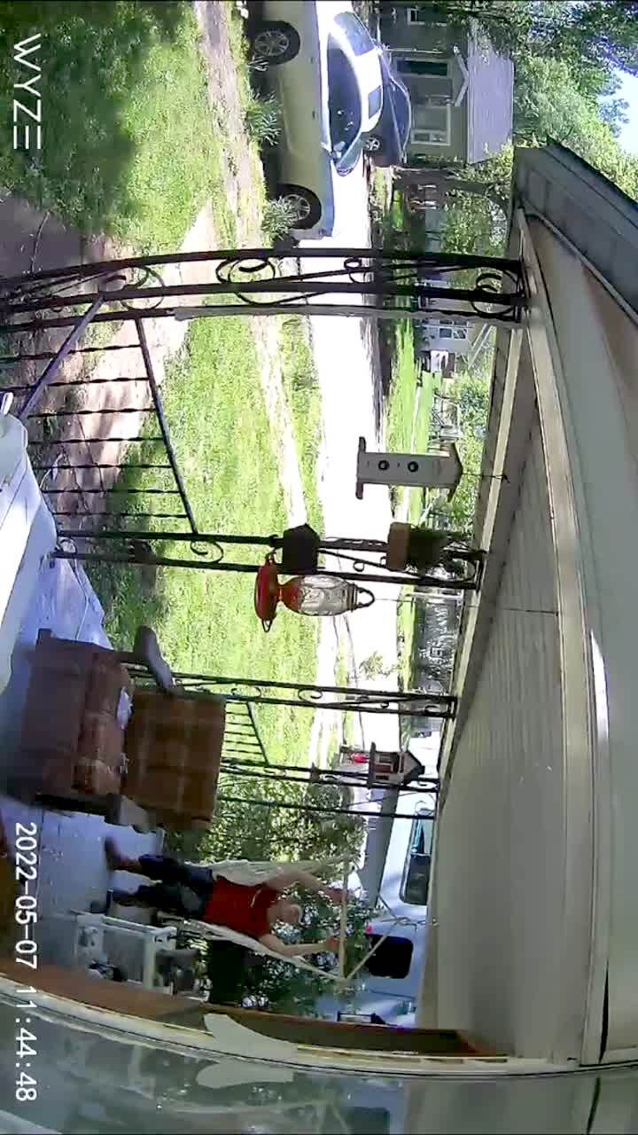 A man sits down on a porch swing but the porch roof does not support the weight and the porch roof collapses down on top of him. Screen recording. Horizontal video. Security footage.