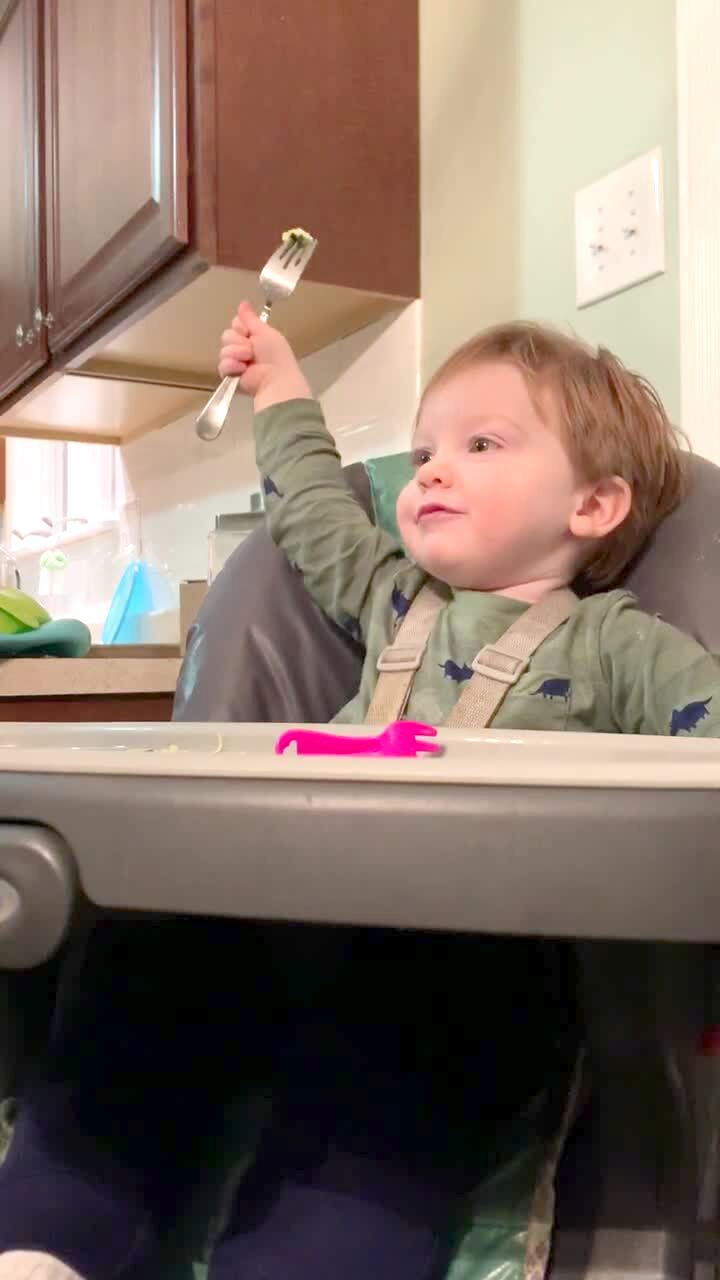 A woman tries to pretend a spoonful of food is an airplane and her tot son takes the fork and drops it on the floor. He then shakes his head and finger at his mom.