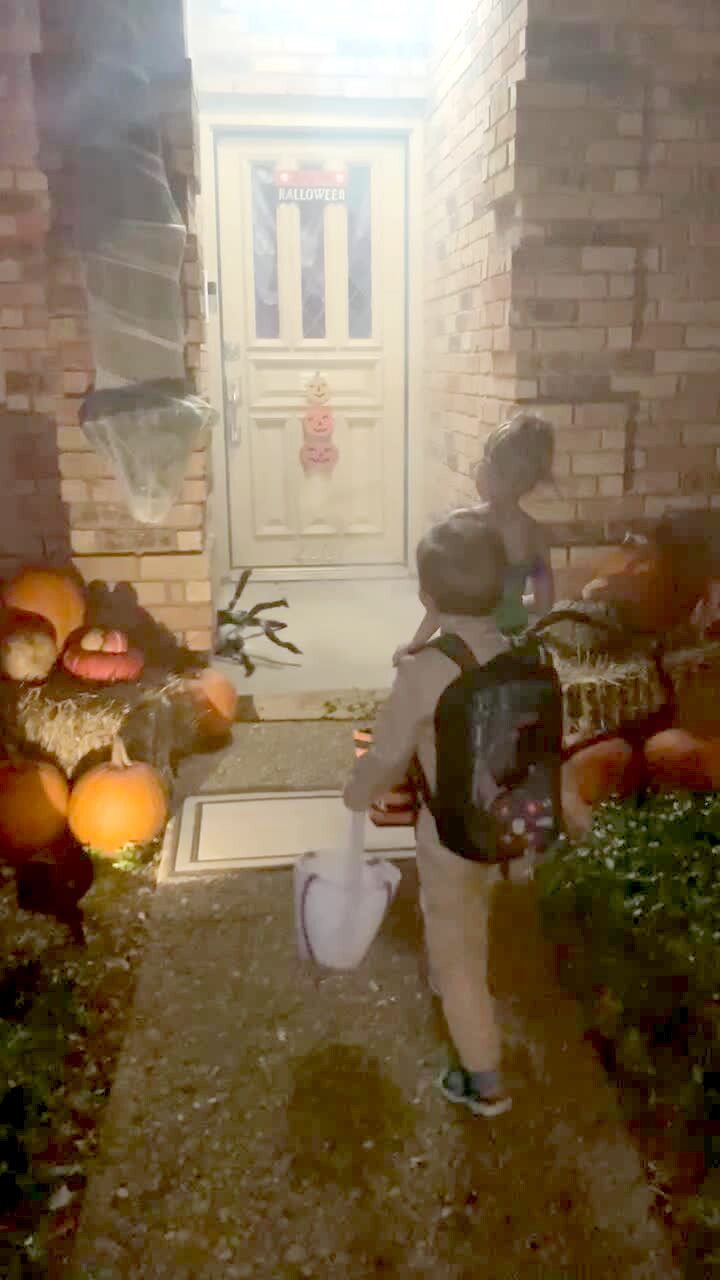 A woman, weighed down with many bags, falls sideways off of a front porch and yells for help. Security footage.