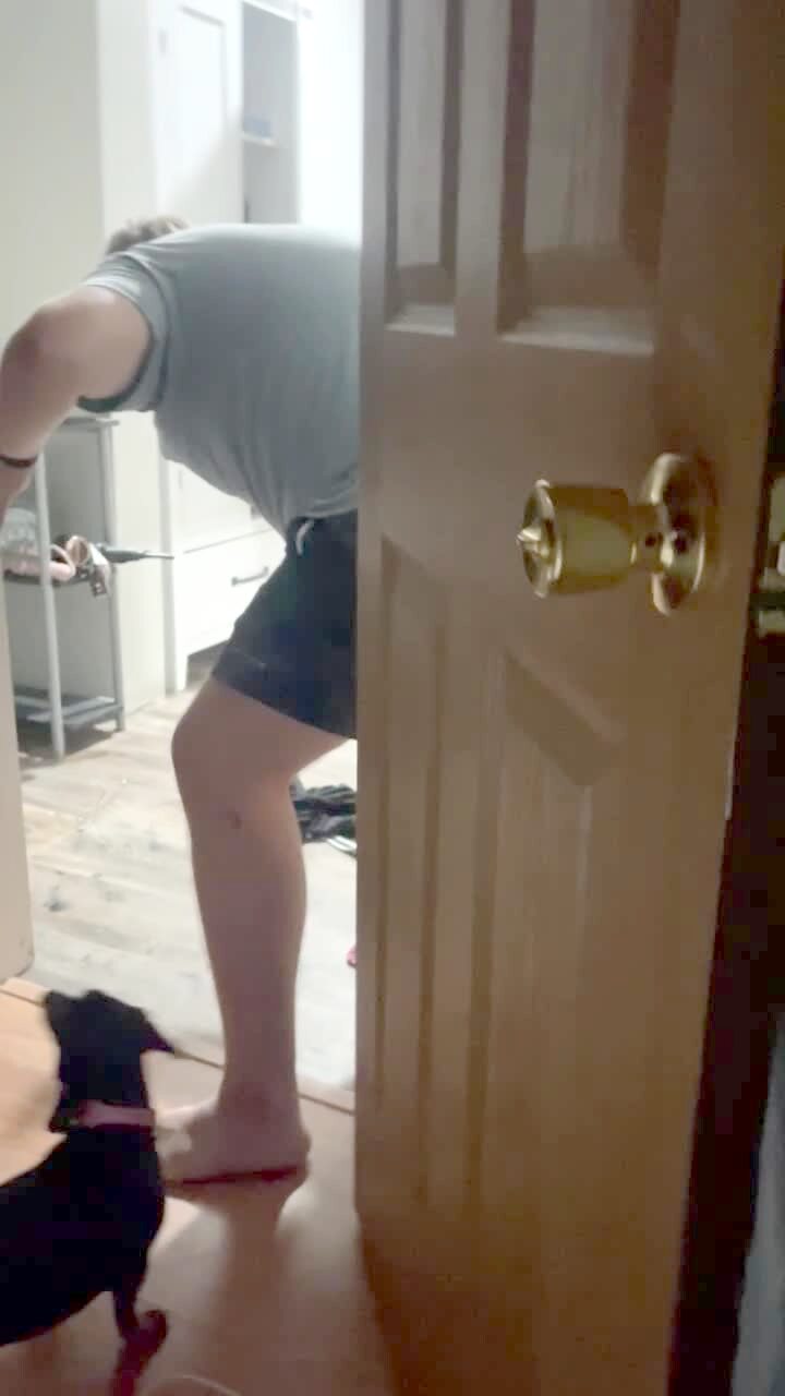 A woman calls an Australian Shepherd dog into a kitchen. Then she shows him a chewed spatula and he turns around and walks away.