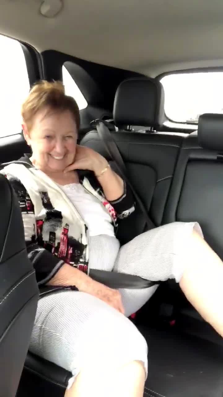 A woman shows how her senior mom got tangled in her seat belt after she took a nap in the back seat of a vehicle.
