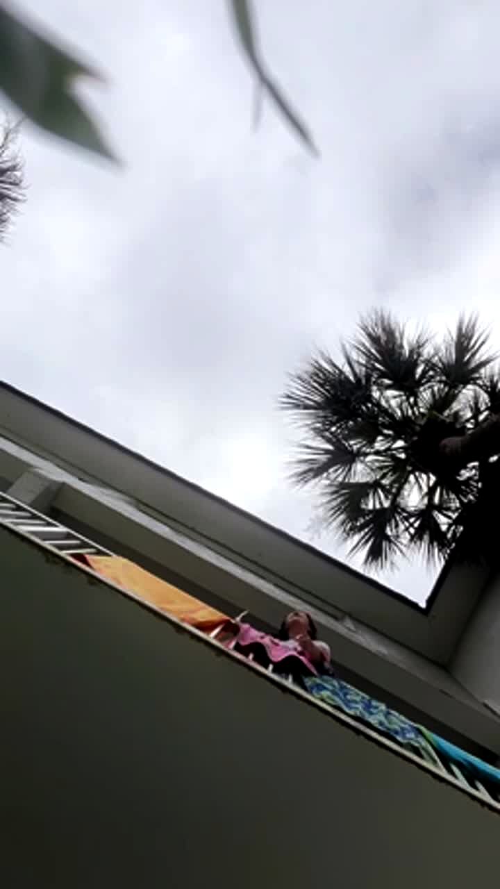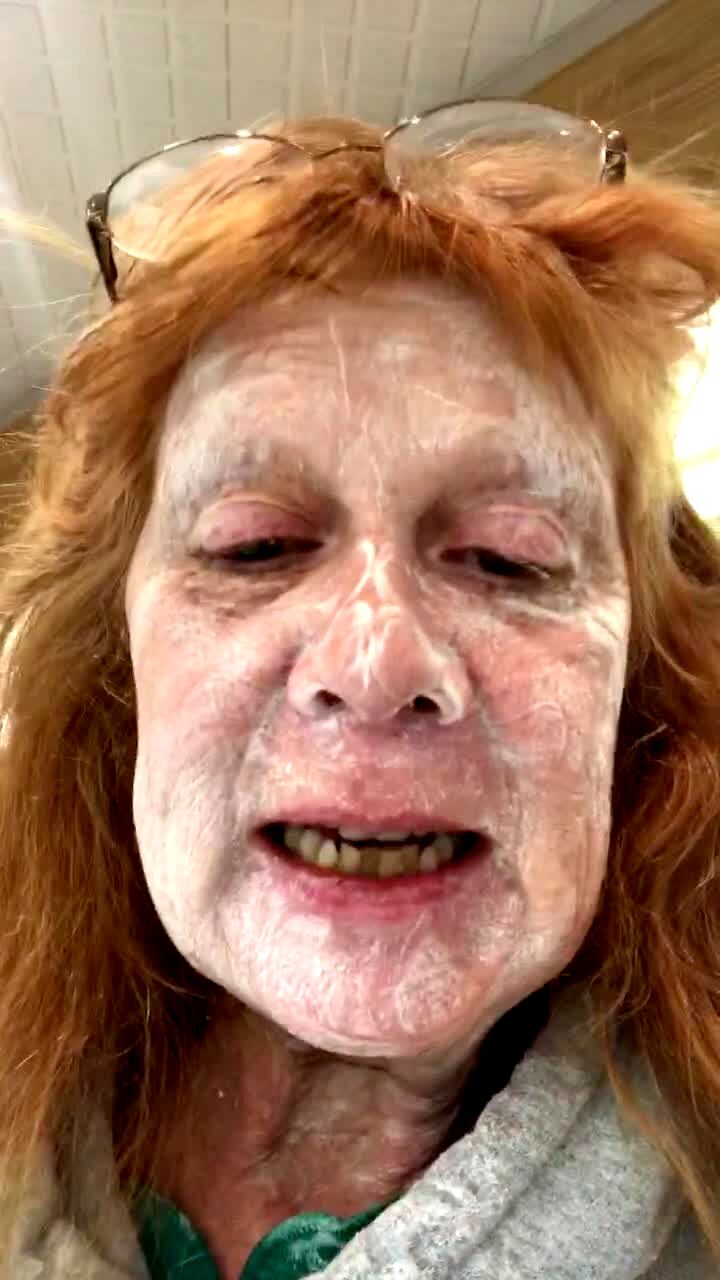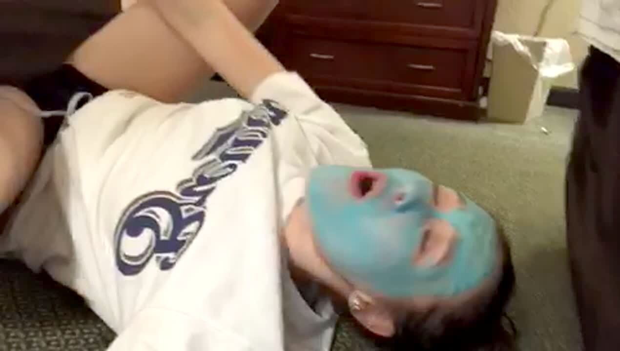 A teen girl records a selfie to show her facial mask and then falls off the bed.