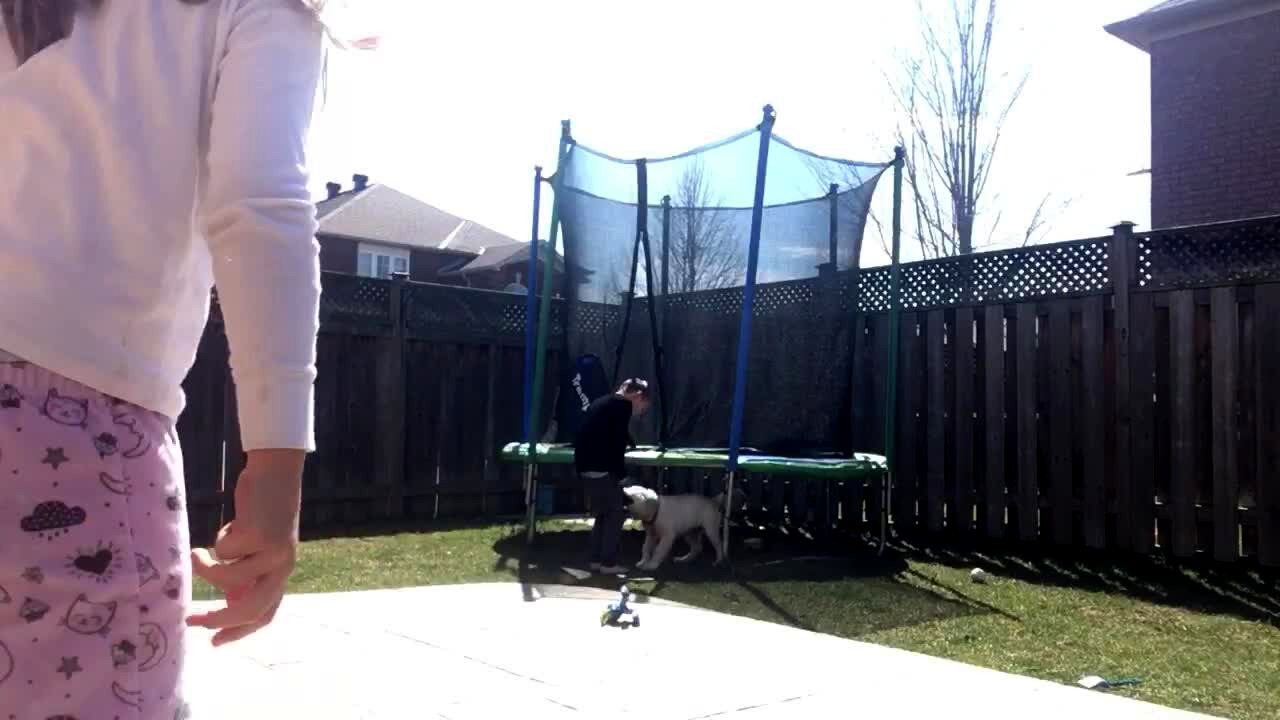 A young girl introduces a YouTube video while a dog play attacks a young boy and pulls on his pants in the background.