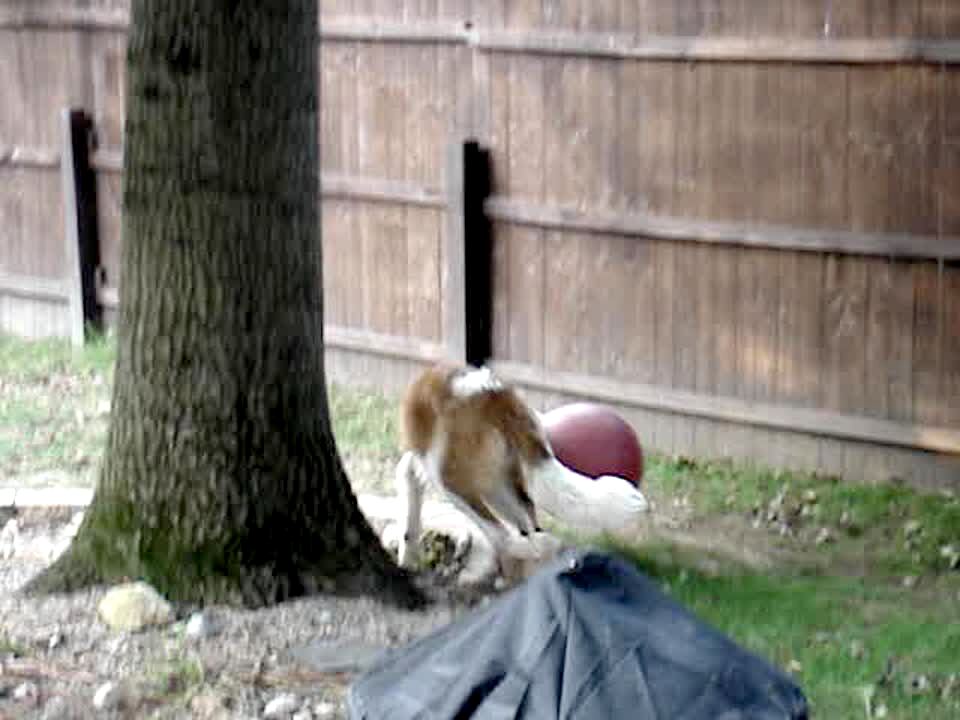 Dog has a red ball stuck on its face. The dog shakes its head until the ball falls off.