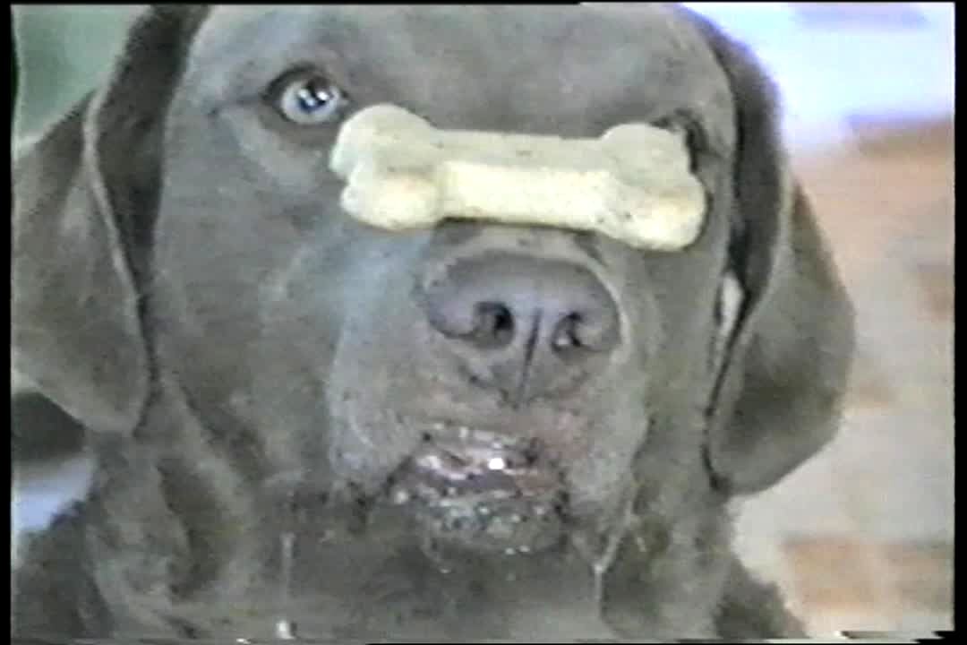 Dog catches dog bone before it falls from nose to floor. Dog also drools all over floor before he is told to eat. Does same trick with ball.