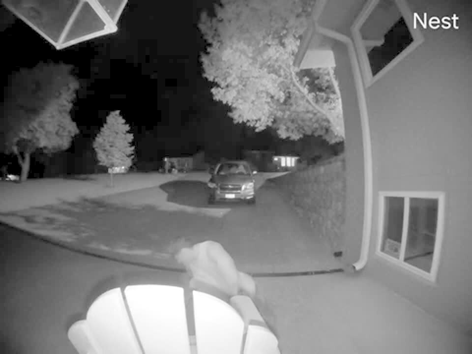 A man slips and falls on ice on a driveway, then farts. Security footage.